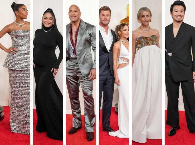 Per Dwayne Johnson il look è in grigio perla, un completo in raso firmato Dolce&Gabbana. Gabrielle Union invece ha scelto un look gioiello d’argento firmato Carolina Herrera. Chris Hemsworth raggiunge gli Oscar in un completo blu accanto alla moglie Elsa Pataky fasciata in un cut out dress total white. Vanessa Hudgens annuncia la gravidanza sul red carpet degli Oscar 2024, fasciata in un long dress total black in velluto di Vera Wang Couture. Vi ha abbinato gioielli Chopard. Anche Julianne Hough raggiunge il tappeto rosso con un jumpsuit di Alexandre Vauthier Couture. Infine Simu Liu ha proposto un completo total black con spilla d’argento di Fendi.