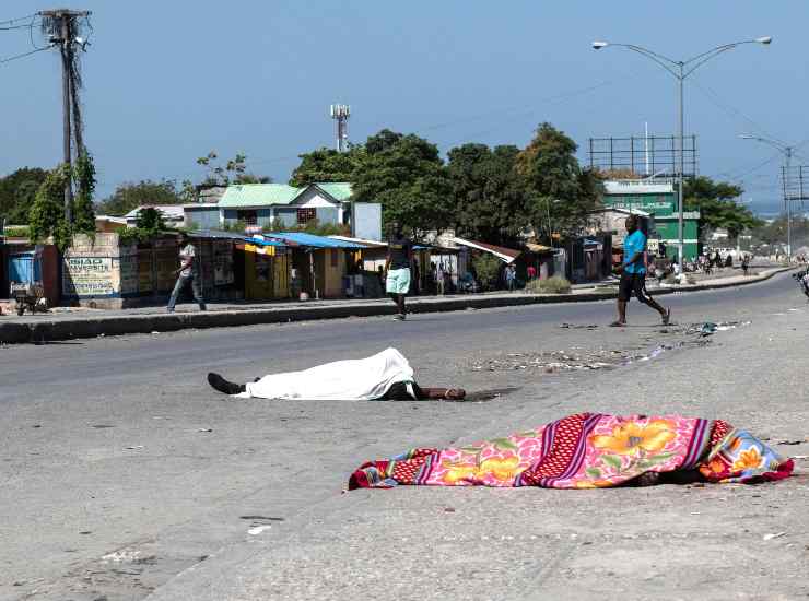 Due corpi senza vita fuori dalla stazione di polizia dell’aeroporto di Port-au-Prince, Haiti. Foto Ansa/Epa Johnson Sabin