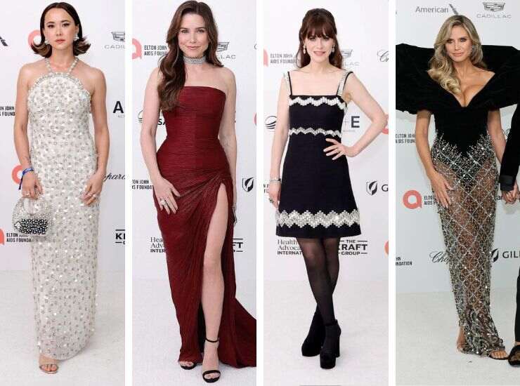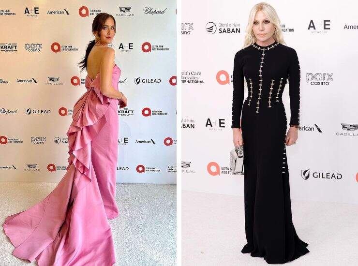 L’abito scelto per l’occasione porta la firma di Marchesa. Valentina Ferragni vi ha abbinato un elegante collier di diamanti di Kwiat Diamonds e sandali di Le Silla. Anche la manicure effetto perla si intona all’abito che insegue ancora il Barbiecore. Anche Donatella Versace ha raggiunto l’evento organizzato da Elton John indossando un long dress total black in velluto con clip ad altezza busto e che percorrono anche tutta la silhouette naturalmente del suo Atelier. Trattandosi di un after party degli Academy Awards, le star sul tappeto rosso non mancano.