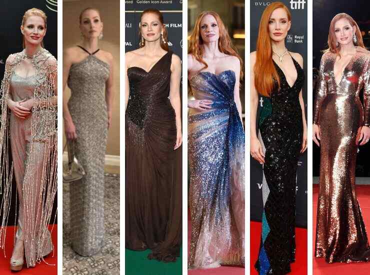 Alla cerimonia d’apertura, invece, ha scelto un completo jumpsuit champagne di Armani Privé. Per i LACMA Art + Film Gala 2023 Jessica Chastain ha preferito un look d’argento, effetto gioiello, con scollo all’americana di Gucci. Anche i preziosi fanno parte della collezione Gucci Fine Jewelry. Al Zurich Film Festival, invece, ha sfoggiato una nuance total brown, un abito drappeggiato con cascata di paillettes ton sur ton di Versace. Il nude si alterna a numerose sfumature di blu e paillettes per il San Sebastian Film Festival. L’abito con scollo a cuore porta la firma di Gucci. Al Toronto Film Festival, ha optato per le paillettes di Armani Privè. Infine, alla Mostra del Cinema di Venezia 2023, ha optato per un long dress aderente in oro di Gucci.