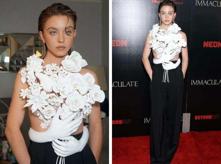 Di ritorno in sala con Immaculate, un film horror girato in Italia con un cast costellato di stelle nostrane come Benedetta Porcaroli e Simona Tabasco, Sydney Sweeney ha partecipato alla première svoltasi a Los Angeles. E, per l’occasione, ha indossato un top scultura a trama floreale che non è passato inosservato, anzi. Non è la prima volta che Sydney Sweeney indossa qualcosa destinato a far parlare. L’ha dimostrato di recente proprio agli Oscar. In occasione degli after party organizzati da Vanity Fair, l’attrice è apparsa sinuosa sul red carpet con indosso un abito che esattamente vent’anni fa Angelina Jolie mostrava proprio al pubblico dell’Academy. Un’ennesima certezza per Sydney Sweeney, che punta allo status da diva.
