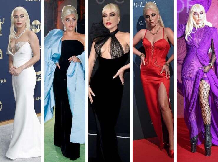 Per i SAG Awards 2022 Lady Gaga ha scelto un look bianco perla, un abito tubino senza maniche con corpetto tempestato di micro paillettes in oro di Armani Privé. Il collier di diamanti a trama floreale è naturalmente di Tiffany&Co. Invece per la première di House of Gucci a Milano nel 2021 ha preferito un look total red di Versace. Per la première a New York, ha optato per un total black in velluto di Armani Privè. Invece, a Londra, il look è Very Peri di Gucci. Infine agli Academy Museum 2021 ha sfoggiato un look di Schiaparelli Haute Couture. L’abito in velluto nero è accompagnato da una mantella in raso azzurro pastello.