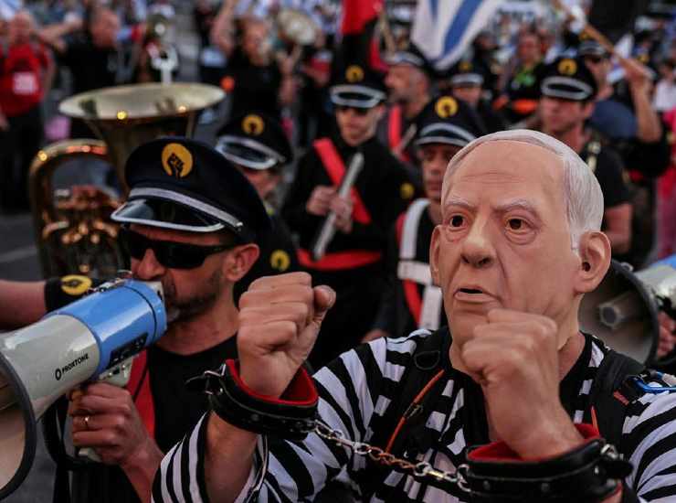 Caricatura di Netanyahu alla manifestazione di Tel Aviv. Foto X @ROBZIK
