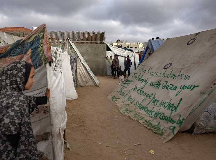 Una tenda nel campo profughi di Rafah con un messaggio di ringraziamento per le proteste pro-Palestina agli studenti della Columbia University di New York. Foto Ansa/Epa Haitham Imad
