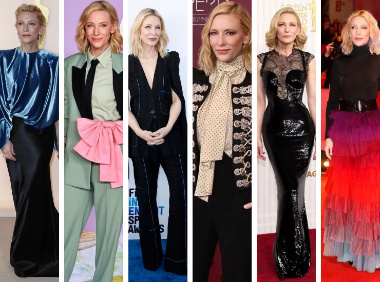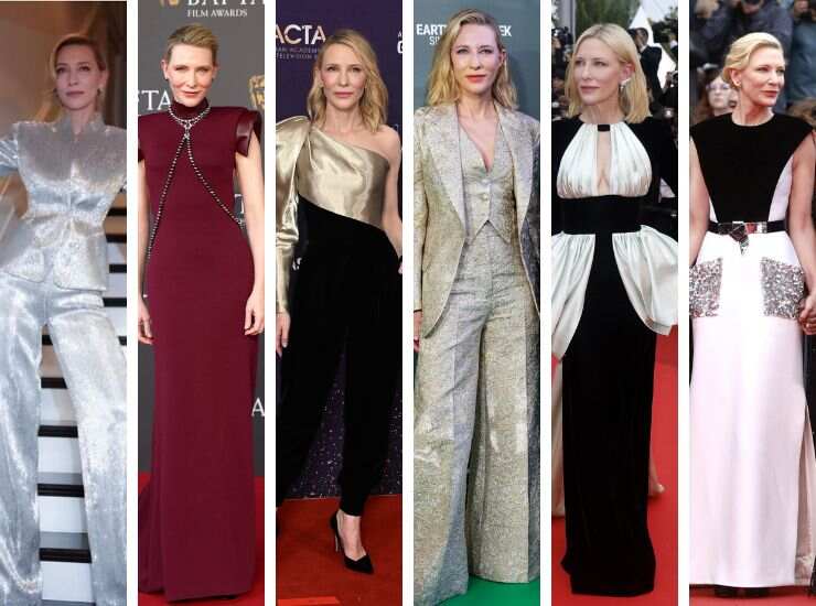Con il supporto della sua stylist Elizabeth Stewart, Cate Blanchett è apparsa su numerosi red carpet. Uno dei più recenti è quello del Outstanding Achievement Awards Gala 2024. Per l’occasione ha sfoggiato un completo due pezzi d’argento effetto specchio, luminoso e con pantaloni a zampa firmato Fendi Couture. Porpora è invece il long dress scelto per i BAFTA 2024, firmato Louis Vuitton. Vi ha abbinato una collana scenografica che avvolge i fianchi della maison. È di Armani Privè, invece, il completo jumpsuit proposto agli AACTA Awards 2024, con pantaloni in velluto nero e top monospalla in oro lucido e drappeggiato.