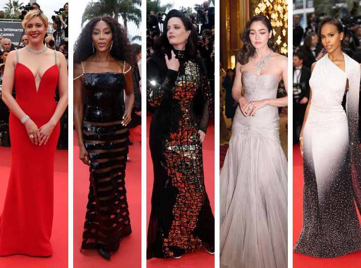 Naomi Campbell, di ritorno a Cannes, ha giocato con le trasparenze indossando un look total black con pailllettes e perline di Chanel. Si tratta di un abito vintage che la modella ha già indossato in precedenza. Eva Green riappare sul tappeto rosso, indossando un look total black ravvivato da una trama metallica di Balmain. Di una delicata sfumatura d’argento è invece il long dress in chiffon con drappeggi scelto da Araya A. Hargate e firmato Giorgio Armani Privé. Bianco con sfumature degradè di grigio e nero è invece l’abito tempestato di cristalli scelto da Sabrina Dhowre Elba firmato Fendi Couture. Vi ha abbinato gioielli di Tiffany&Co.