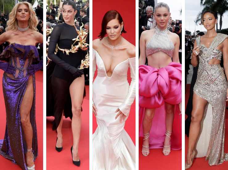 Victoria Silvstedt riappare a Cannes portando un pizzico di colore sul tappeto rosso. Il suo long dress viola è ravvivato da paillettes e porta la firma di Ziad Nakad. Total black è l’abito in chiffon che gioca con le trasparenze scelto da Iris Mittenaere, con applicazioni in oro che si arrampicano sul busto e sul braccio di Stephane Rolland. Bianco perla è invece il long dress con scollatura profonda e drappeggi in stile Mermaidcore proposto da Maëva Coucke. Rosa shocking è la gonna scultorea in raso proposta da Romane Bertrand accompagnata da un crop top d’argento. Infine Flora Coquerel non rinuncia al cut out, con un look metallico che rincorre oro e argento.