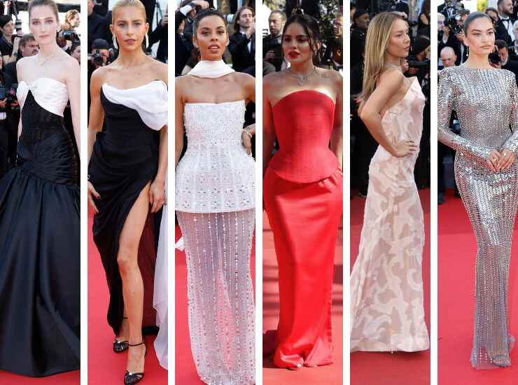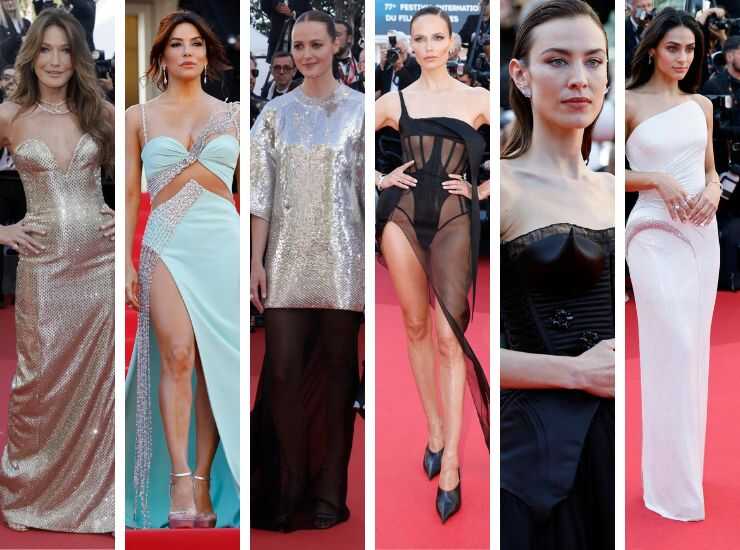 Anche Carla Bruni torna in quel di Cannes. Per il quinto red carpet, l’attrice ha preferito un look champagne con paillettes e scollatura Mermaidcore firmato Celine. Per Eva Longoria il secondo red carpet consecutivo alla Croisette è all’insegna delle sfumature pastello, con un verde menta delicato e dettagli cut out ravvivato da cascata di cristalli di Tony Ward Couture. Natasha Poly gioca con le trasparenze riportando sul tappeto rosso il fascino del body-dress, accompagnato da una trama in chiffon total black di Mugler. Renate Reinsve, invece, ha accompagnato la gonna in tulle con un minidress oversize rivestito di paillettes argentate effetto metallico di Louis Vuitton. Per Alexa Chung il red carpet è total black con una creazione di Jean Paul Gaultier. A colonna è l’abito bianco perla e rivestito di strass scelto da Renata Notni firmato Versace. Vi ha abbinato dei gioielli Bulgari.