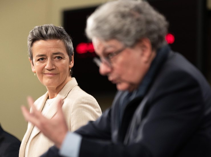 Margrethe Vestager e il commissario dell’Unione europea per il mercato interno, Thierry Breton. Foto Ansa/Epa Olivier Hoslet