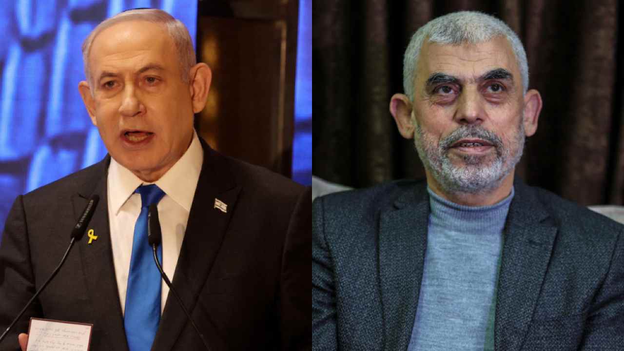 Il premier israeliano Netanyahu (a sin.) e il capo di Hamas a Gaza, Sinwar. Foto Ansa/Epa