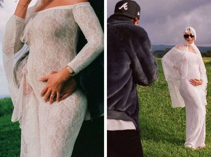 L’assenza di Hailey Bieber al Met Gala non è passata inosservata, ma probabilmente c’era un motivo ben studiato dietro. Di fatto l’annuncio della gravidanza è arrivato tempestivo, quasi a voler giustificare l’assenza su uno dei suoi più cari red carpet. E, per l’occasione, la Bieber ha indossato un abito bianco da sposa che ricorda proprio quello delle sue nozze. Alle Hawaii per rinnovare le promesse nuziali, i coniugi hanno così immortalato il momento in un servizio fotografico. Le curve della gravidanza appaiono ben evidenti nel suo abito bianco di Saint Laurent.
