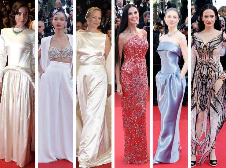 Luma Grothe ha scelto un completo tre pezzi: un tailleur total white con pantaloni palazzo a vita alta, mantella aperta e crop top gioiello con fiori ricamati d’argento firmato Atelier Emé. I preziosi portano la firma di Damiani. Uma Thurman, sul tappeto rosso di Kinds of Kindness, ha sfoggiato un total white bianco in raso accompagnato da una mantella bianco perla di Burberry. Demi Moore ha partecipato attivamente a questa edizione: l’abito che ha brillato più di tutti è quello rosso corallo ravvivato da fiori in rilievo di Giorgio Armani Privé. Della stessa maison è l’abito azzurro ghiaccio lucido scelto da Hunter Schafer. Anche Eva Green è apparsa più volte sul red carpet in questa edizione di Cannes, senza tradire la palette black&white. Come il look con delicati ricami in pizzo di Iris Van Herpen.