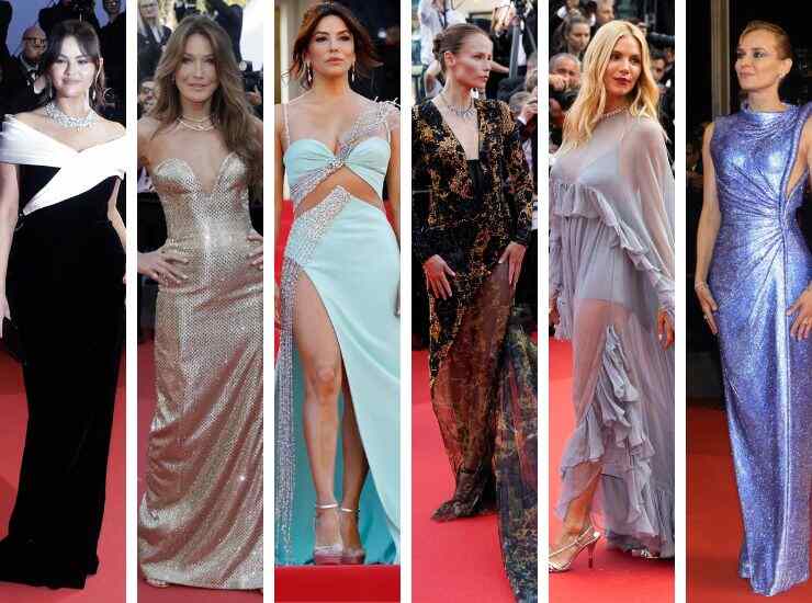 Black&white è l’abito scelto da Selena Gomez. Il suo long dress in velluto con scollatura intrecciata e drappeggiata porta la firma di Saint Laurent. L’attrice vi ha abbinato dei gioielli di Bulgari. Brilla anche Carla Bruni, fasciata in un abito aderente con scollatura a U di una brillante tonalità di oro firmato Celine. Anche Eva Longoria è apparsa più volte sul red carpet di Cannes. Uno dei due look per questa edizione è verde menta, con tocco gioiello che ritroviamo nelle frange d’argento che accompagnano la gonna. E nella scultura tentacolare ad altezza petto. Il suo look cut out è di Tony Ward.