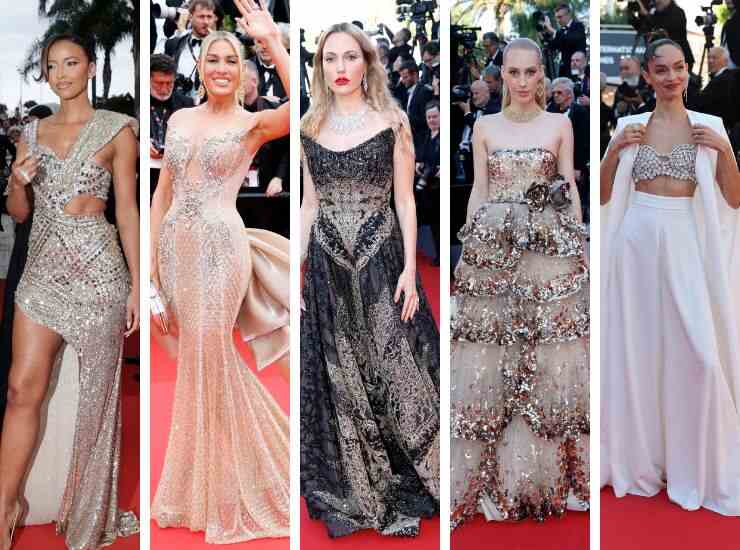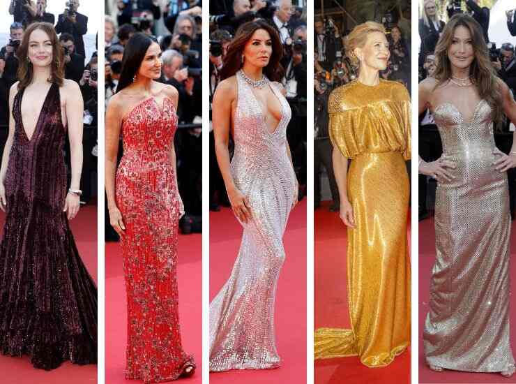 Demi Moore ha unito i trend con un abito colonna di Giorgio Armani Privé sfumatura corallo e impreziosito da una trama floreale d’argento in rilievo. Stesso discorso vale per Eva Longoria, che ha indossato un long dress avorio aderente interamente rivestito di paillettes di varia grandezza di Elie Saab. Per Cate Blanchett il primo red carpet a Cannes è in oro: il suo abito rivestito di paillettes è firmato Louis Vuitton. Di Celine è invece l’abito champagne aderente effetto armatura proposto da Carla Bruni, scintillante in tutti i suoi glitter. Per Alessandra Ambrosio le paillettes di certo non mancano: la sfumatura scelta è di un argento metallico che ricorda un’armatura glam, firmata Tom Ford.