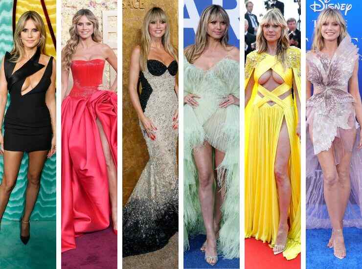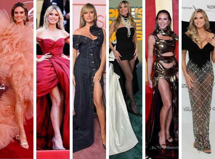 In occasione dei Fashion Trust US Awards 2024, invece, ha preferito esaltare il trend del total demin, indossando una creazione in denim scuro accompagnato da una cascata di bottoni e spacco vertiginoso ad altezza coscia di Sonia Carrasco. Black&white è invece il long dress proposto ai People’s Choice Awards di Kamilla Purshie, accompagnato da una cascata di perle ad altezza collo. Ai Vanity Fair Oscar Party 2024, invece, Heidi Klum ha scelto un look cut out dal taglio futuristico, in oro ma lucido effetto specchio, di Harris Reed. Ai party degli Oscar organizzati da Elton John, invece, ha sfoggiato un abito che gioca con le trasparenze di Alevi Milano.