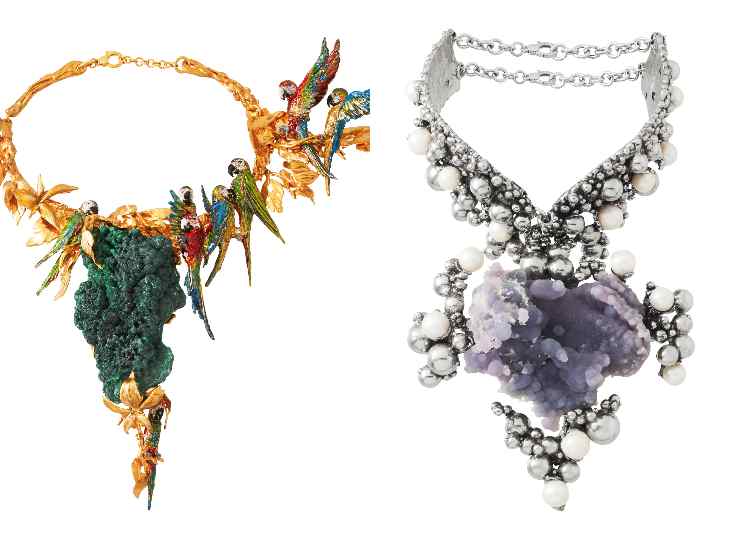 a destra collana Pappagalli, con gli uccelli svolazzanti coperti di smalti colorati, le immense foglie tropicali in bronzo dorato, ma soprattutto la grande malachite, un minerale di un verde intensissimo che ricorda, per forma e colore, il cuore pulsante e profondo della selva amazzonica, a sinistra collana Bollicine un calcedonio color violetto, con bolle sferiche realizzate in bronzo bianco e alcune luminose perle barocche, Courtesy of Press Office