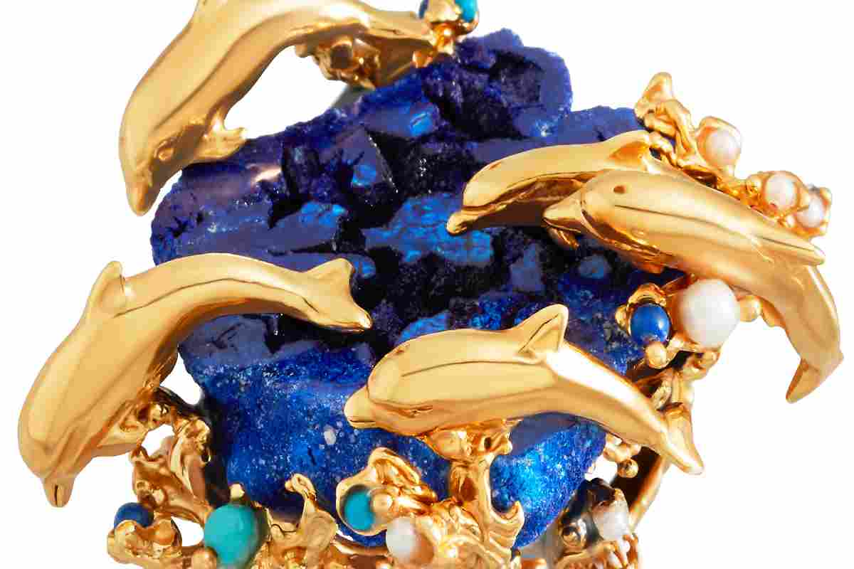 anello Profondo Blu abbellito da un’intensa azzurrite, sulla quale delicati delfini in argento dorato saltano e si rincorrono, Courtesy of Press Office