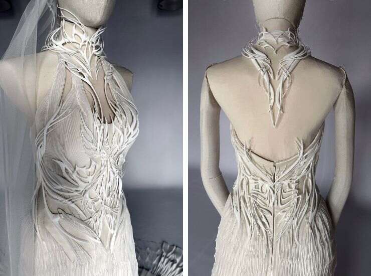La realizzazione di quest’abito è un perfetto equilibrio. Da un lato punta alle tecniche della couture tradizionale con la plissettatura, il drappeggio e le perline; dall’altro, invece, aggiunge elementi innovativi come la stampa del silicone e il taglio laser. Secondo la stilista, la stampa 3D è sicuramente complicata ma non impossibile. “È un processo molto complicato. Sì, devi acquisire familiarità, ma una volta capito, non penso che sia molto più difficile di alcuni dei metodi di lavoro più tradizionali“, è il suo commento a WWD.