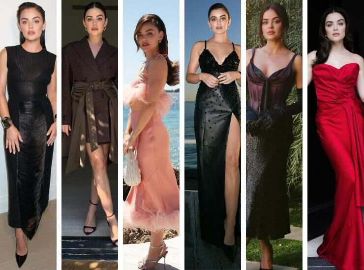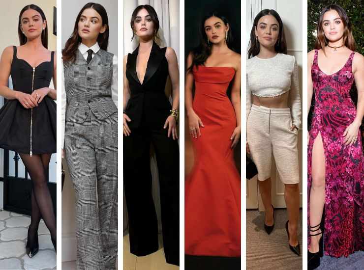 Per LA Art Show per American Heart Association nel 2024, Lucy Hale ha indossato un minidress total black con maxi zip che percorre l’abito in tutta la sua lunghezza e firmato Alexander McQueen. Invece sul tappeto rosso di Women in Entertainment organizzato da The Hollywod Reporter nel 2023 ha preferito un completo in tartan con camicia bianca di Dior Resort 2024. In supporto a Max Mara per Face of The Future Award 2023, ha optato per un altro completo ma total black con pantaloni zampa e gilet scollato del brand. E torna il rosso, questa volta sfumatura corallo, per i Baby2Baby 2023. Un look firmato Monique Lhuillier. Sul red carpet del Longchamp x Robert Indiana ha optato per un look in tweed bianco di Longchamp. Infine è a trama floreale e di una vibrante sfumatura magenta il long dress proposto ai Fashion Trust US 2023 di Versace.