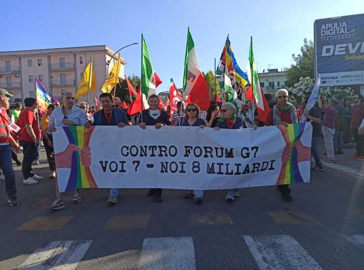 Il corteo contro il forum G7 organizzato a Fasano (Brindisi) il 14 giugno 2024. Foto Ansa/Danilo Santoro