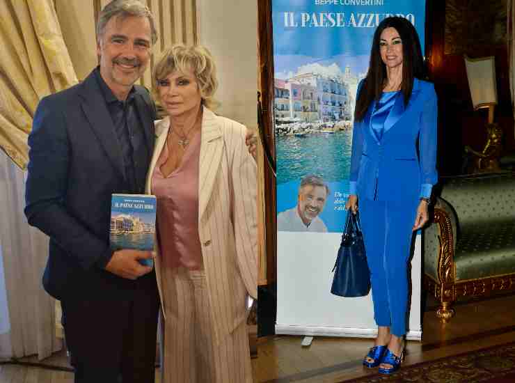 A sinistra Beppe Convertini con Carmen Russo, a destra Manuela Arcuri alla presentazione del libro Il Paese Azzurro, Courtesy of Beppe Convertini