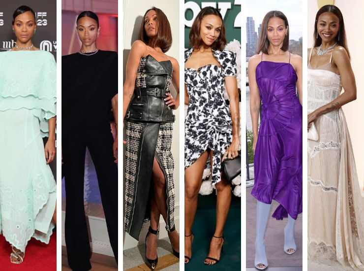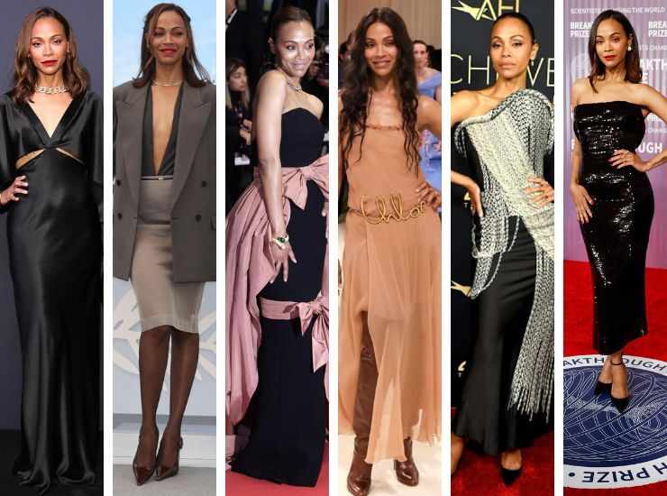 Sul tappeto rosso del Festival di Cannes per la première del film, Zoe Saldana ha scelto un’altra creazione di Saint Laurent che alterna il total black con scollatura a onda con l’aggiunta di una mantella rosa antico in raso che si intreccia alla silhouette attraverso maxi fiocchi. Si tratta di un look d’archivio della collezione Haute Couture SS 1986. I preziosi, invece, portano la firma di Boucheron. Sul red carpet del Met Gala 2024, per Zoe Saldana si punta al nude look, fasciata in un long dress che gioca con le trasparenze di Chloé. Di Victoria Beckham è invece l’abito scultoreo proposto all’AFI Lifetime Achievement Award Gala 2024. In occasione della Breakthrough Prize Ceremony 2024, ha sfoggiato un midi total black ravvivato da paillettes ton sur ton di Givenchy.