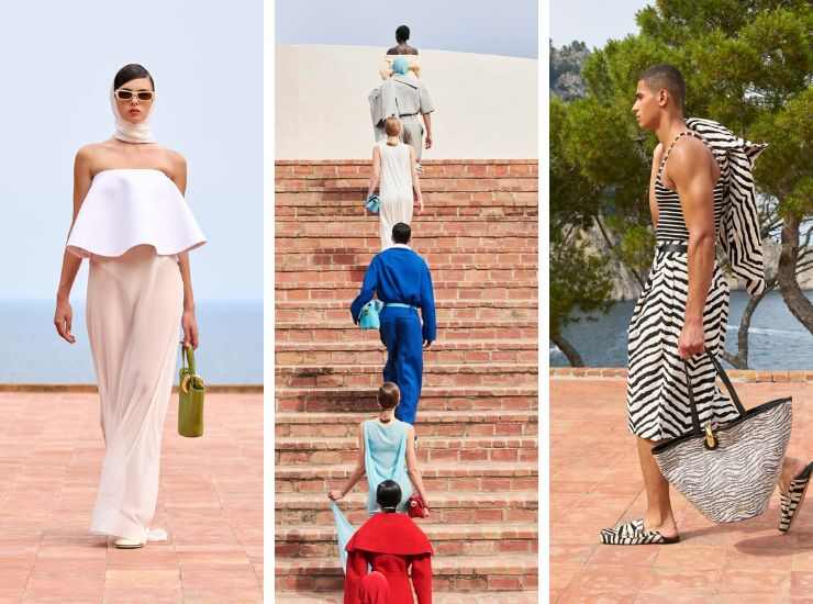 Svoltasi il 10 giugno 2024 sull’isola di Capri, la sfilata La Casa di Jacquemus rende omaggio ad una delle scene più iconiche del film Il disprezzo con Brigitte Bardot, che avvolta nel suo accappatoio giallo scende la scalinata di Casa Malaparte. La stessa che accompagnerà anche le modelle di Jacquemus. Anche il motivo dell’accappatoio della Bardot tornerà protagonista della collezione. Simon Porte ne ha realizzato una versione tutta sua, di un delicato giallo burro. E non è l’unico colore brillante che accompagna le sue modelle in passerella. Si spazia tra il blu cielo, il rosso vivace e sfumature di salvia brillante.