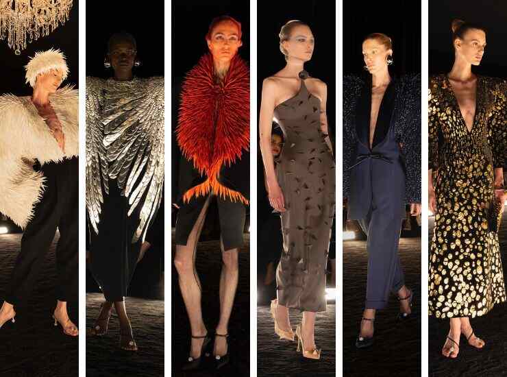 Piume corallo, come quelle rosso vivo che spezzano il total black di un tailleur destrutturato e audace. O ancora piume con paillettes, come quelle aggiunte al tailleur blu notte con maxi scollatura a bavero in velluto. Le piume di Schiaparelli illuminano e conquistano la notte, si alternano tra materiali e colori. Come riporta Vogue, il direttore creativo ha raccontato: “Recentemente mi è stato detto che la gente non compra Schiaparelli, la colleziona. È questo che rende la Haute Couture così speciale: è l’espressione della mia visione della maison oggi, libera dal marketing e dal merchandising. Ma è anche qualcos’altro: un modo per onorare questo rapporto, uno dei più intimi al mondo, quello in cui dò alle donne il potere di rinascere, ancora e ancora e ancora“.