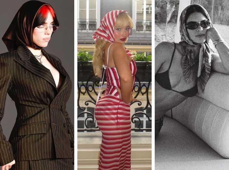 Billie Eilish aveva già anticipato di mesi la tendenza dell’estate 2024. Qualcuno potrà ricordare facilmente il suo look agli Academy Museum Gala 2023, fasciata in un completo gessato dalla profonda scollatura il cui pezzo forte era proprio un foulard. In raso, sfumatura cioccolato, raccoglie la chioma scura con mèche rosso fuoco che s’irradiano dalle radici dei capelli e ravvivano il look. A distanza di mesi, il foulard torna protagonista della scena. Lo dimostra, ad esempio, Sabrina Carpenter che partecipa al Vogue World: Paris, un evento ultra glam dove ha proposto una creazione di Jacquemus. D’ispirazione vintage, il completo a righe propone una sfumatura rosso fragola che accompagna non solo l’abito, ma soprattutto il foulard in pendant che raccoglie i lunghi capelli biondi della popstar.