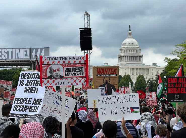 Proteste contro il primo ministro israeliano Benjamin Netanyahu a Washington. Foto X @Sunny_000S