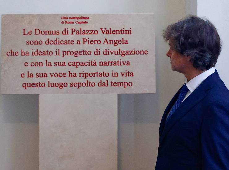 Alberto Angela davanti alla targa dedicata al padre Piero a Palazzo Valentini a Roma. Foto Ansa/Fabio Frustaci