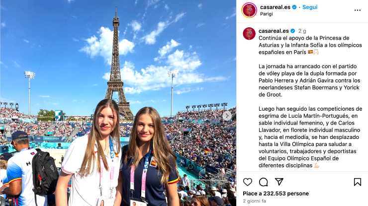 Sono Leonor e Sofia di Spagna a rappresentare la monarchia a Parigi durante le Olimpiadi 2024. L’erede al trono e la sorella minore, oltre a fare il tifo durante le gare nelle diverse discipline in cui gareggiano gli atleti spagnoli (scherma, sciabola individuale femminile, fioretto individuale maschile, pallamano, tennis), stanno incontrando anche volontari e operatori per salutarli e ringraziarli del loro importante contribuito alla manifestazione. Le due sorelle stanno presenziando insieme alle diverse gare che vedono coinvolti gli atleti spagnoli e tra i tanti momenti di entusiasmo si sono mostrate particolarmente euforiche durante le performance dei due idoli del tennis spagnolo, Rafa Nadal e Carlos Alcara.
