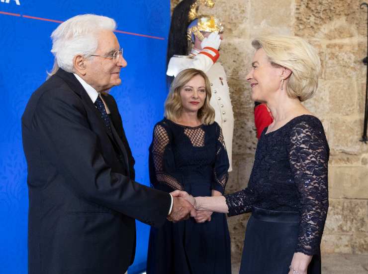 Ursula von der Leyen saluta Sergio Mattarella davanti a Giorgia Meloni al G7 in Puglia lo scorso giugno. Foto Ansa/Quirinale/Francesco Ammendola