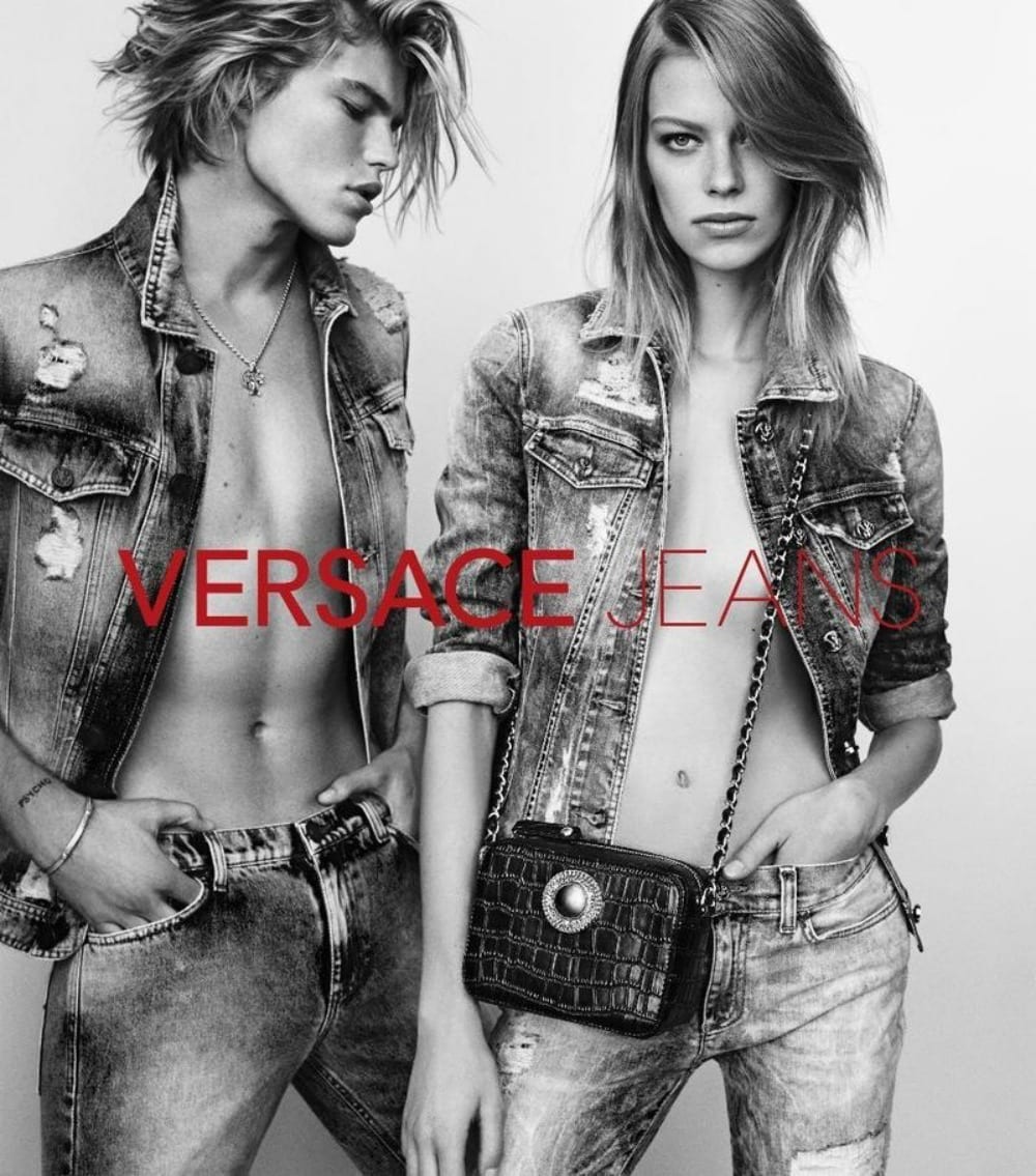 Una coppia di modelli, belli giovani e sfrontati, che racchiudono nei loro sguardi e nelle loro pose il significato, che dell’intera collezione Versace Jeans, ideata sia per l’uomo che per la donna. Jordon Barret e Lexi Boling fasciati in pantaloni e giacche di jeans strappati, decorati o da fantasie grintose, mostrano la sensualità, la personalità e l’indole che da sempre contraddistingue l’intero brand.