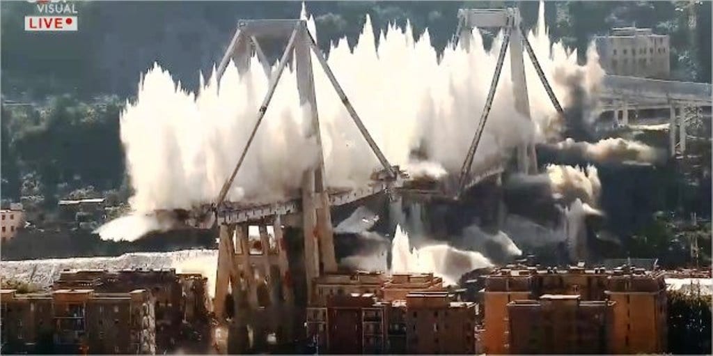 Demolito ciò che restava del ponte Morandi di Genova. A quasi un anno dalla tragedia del crollo della struttura, a seguito del quale morirono 43 persone, oggi 28 giugno si è svolto l’ultimo atto. Prima della ricostruzione. Per l’ultima volta, per sei secondi, il ponte Morandi è esistito. Poi la deflagrazione controllata che ha fatto cadere gli ultimi piloni, attorno alle 9:30 di stamani (video da Twitter di Jari Pilati @jaripilati)