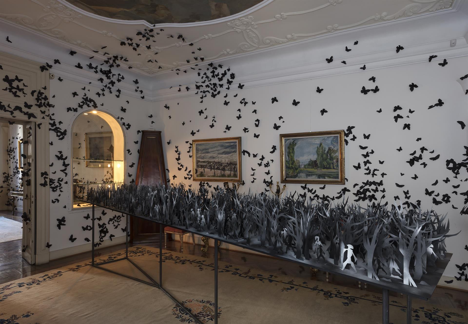 Con Black Cloud, uno sciame di migliaia di farfalle nere invade gli ambienti della Fondazione già a partire dallo scalone d’ingresso. 15.000 farfalle popolano gli spazi nuovi e quelli già esistenti della Fondazione. Con Life in the folds l’artista mette invece in scena il tema della violenza dell’uomo sull’uomo. Una violenza che alberga nel profondo e che può esplodere in modo ingiustificato. Il progetto comprende, tra l’altro, un video di animazione in cui, mentre assistiamo a una drammatica vicenda, vediamo anche le mani del burattinaio che muove i fili dei protagonisti: metafora della mistificazione a cui, che ne siamo consapevoli o meno, la storia e le nostre azioni sono sottoposte.