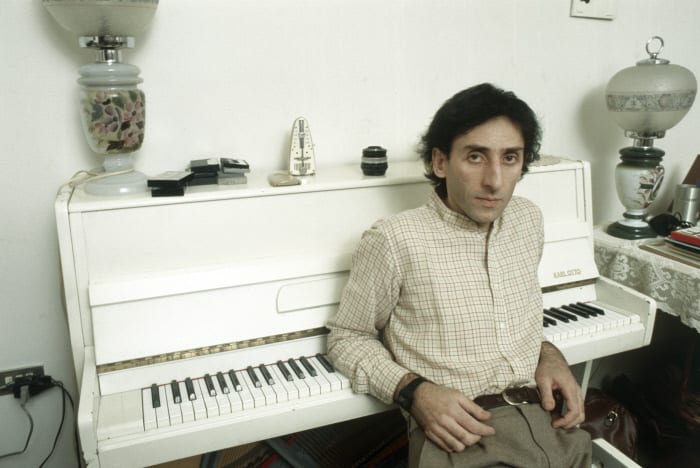 Italian singer-songwriter and director Franco Battiato posing sitting in front of a white piano. 1981