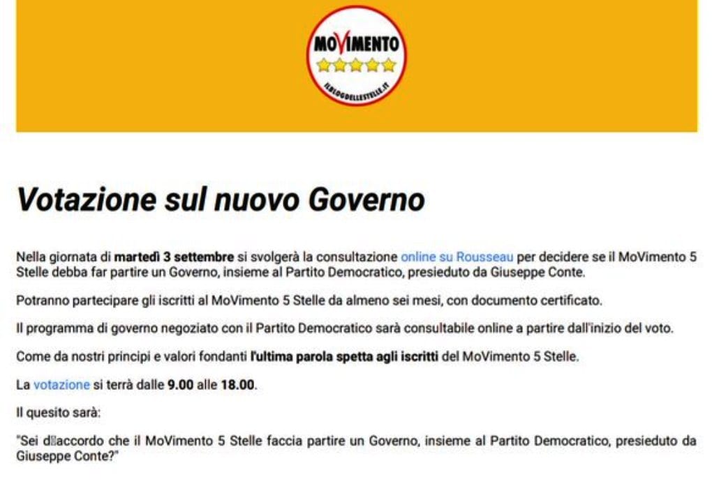 Martedì 3 settembre gli iscritti al M5S voteranno sulla piattaforma online “Rousseau”. Non si tratterà di un passaggio banale. Se dovesse emergere la bocciatura dell’intesa fra Luigi Di Maio (M5S) e Nicola Zingaretti (Pd) non è chiaro cosa possa accadere al già fragile accordo per un nuovo esecutivo fra due forze politiche avversarie acerrime fino a poco fa.