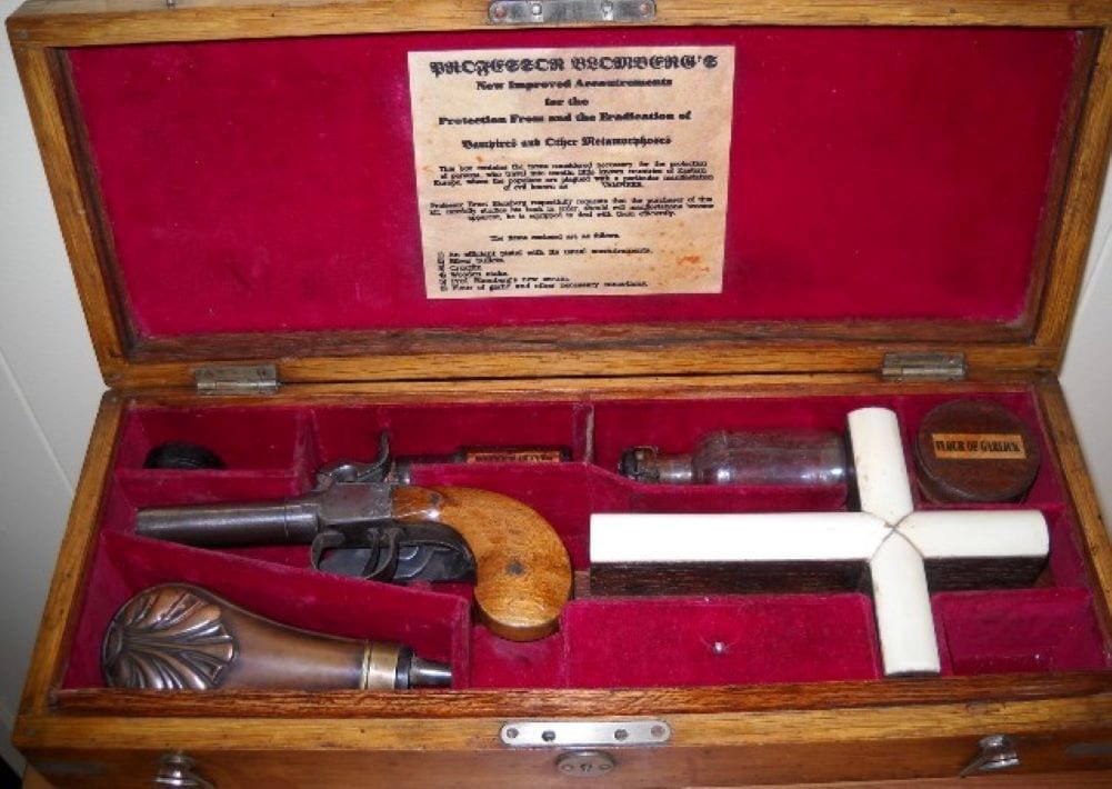 Per 4.500 modici dollari un misterioso acquirente ha fatto suo il kit completo per salvarsi da eventuali incursioni in Transilvania (foto in alto). Una boccia di acqua santa, un paletto di avorio, il Nuovo Testamento e altro ancora…