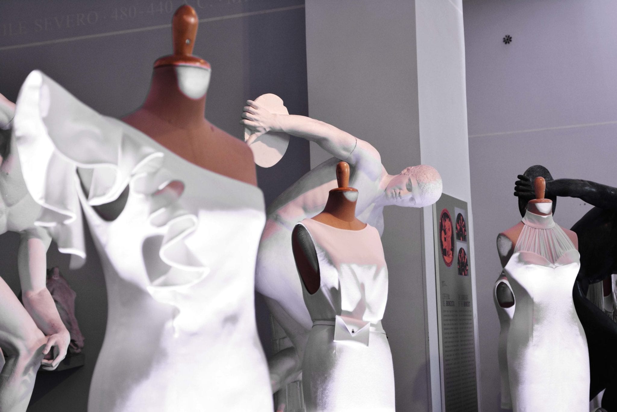 La prima scuola di alta moda fondata nel 1951, conosciuta come l’Accademia Koefia insieme al Corso di Laurea in Scienze della Moda e del Costume dell’Università La Sapienza di Roma, hanno immaginato un dialogo che mette in rilievo la bellezza fra i corpi scultorei del Museo dell’Arte Classica con le creazioni tessili degli allievi. Il bianco dei 1200 calchi di gesso, che ripercorrono l’evoluzione della scultura antica greca e romana, si fondono perfettamente col bianco dei 40 tubini esposti nel Museo.