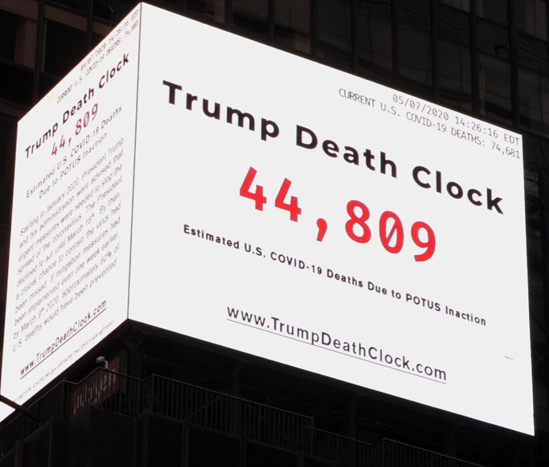 Si tratta di un pannello luminoso che segnala l’aumento progressivo delle vittime del coronavirus alle quali si sarebbe potuto salvare la vita. Se l’amministrazione Trump si fosse mossa con maggiore celerità, determinazione ed efficienza nella lotta alla pandemia.