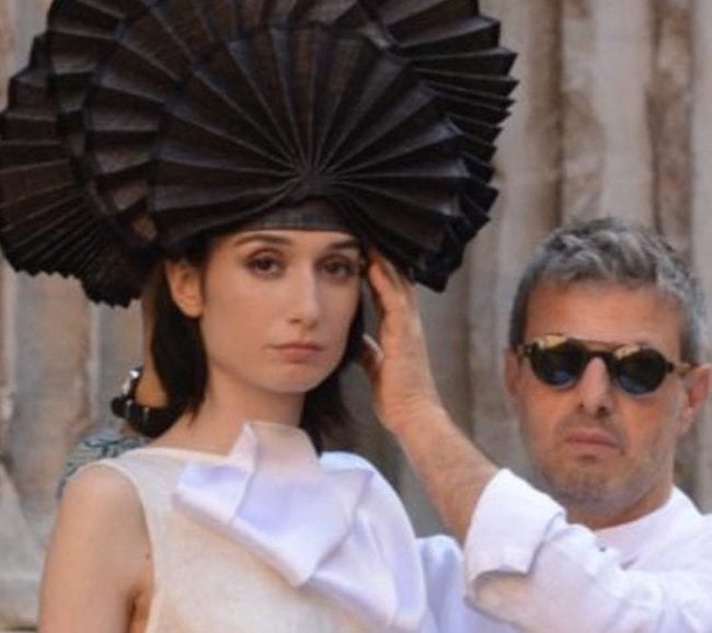 Il ventaglio viene ripreso nell’originale e scenografico cappello, che sicuramente avrebbe indossato con piacere Marina Ripa di Meana, musa ed amica di Camaiani.