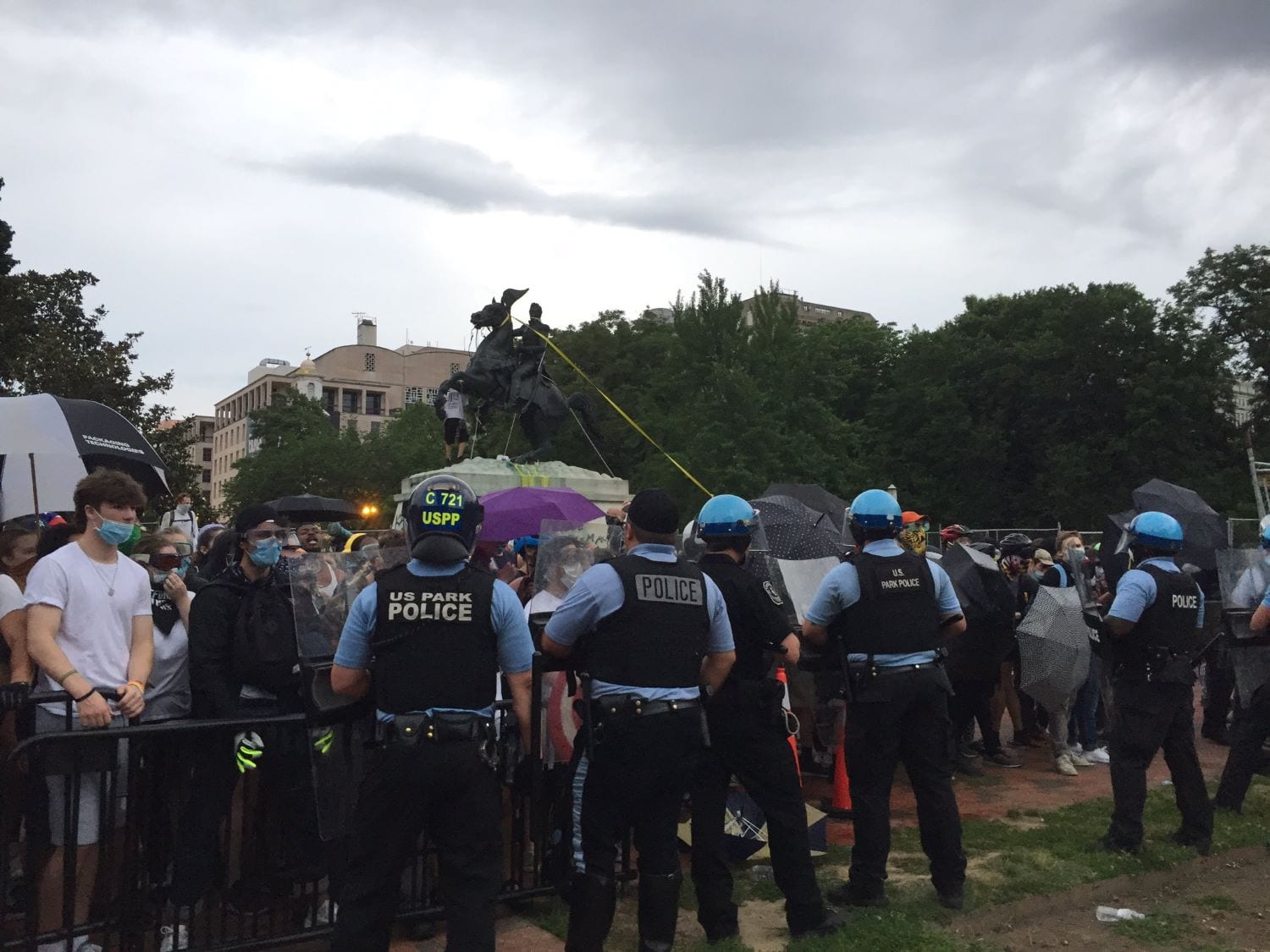 L’intervento delle forze dell’ordine è stato immediato: la polizia ha usato spray al peperoncino contro i 150-200 manifestanti presenti e ha formato un cordone per proteggere la statua di Jackson e la Casa Bianca. La statua si trova a Lafayette Square, nei pressi dell’edificio presidenziale, da cui il Secret Service ha fatto uscire tutti i giornalisti. Cantando “Hey, Hey, Ho, Ho, Andrew Jackson’s got to go” (deve andarsene) i manifestanti hanno legato la statua con delle corde con l’obiettivo di abbatterla. Un gesto forte, a pochi passi dalla residenza del presidente.