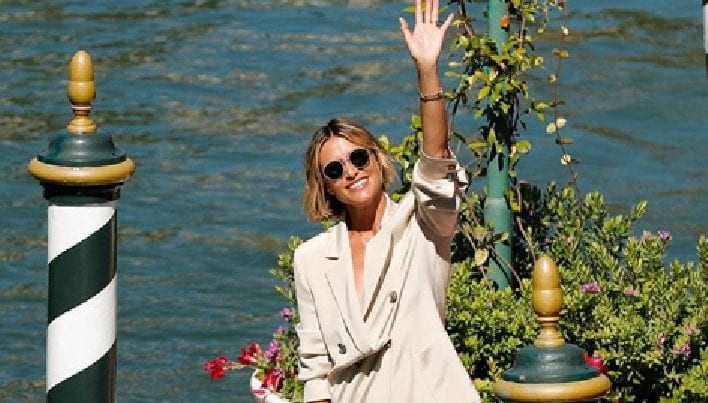 In Laguna ha stregato il pubblico con outfit semplici ma elegantissimi, come il completo giacca e pantalone beige di Armani, quello nero gessato con camicia bianca, o l’abito da sera, sempre di Armani, con le spalle scoperte e il corpino illuminato da jais indossato sul primo red carpet.
