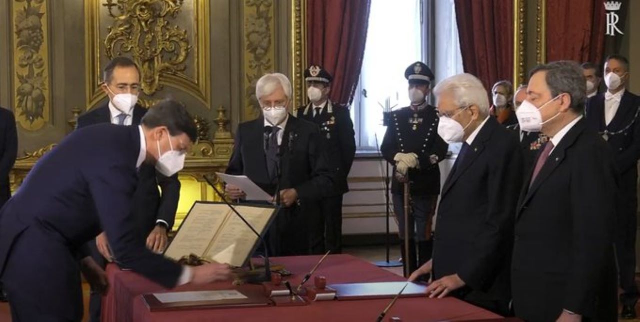 Alle 12 di oggi 13 febbraio è avvenuto al Quirinale, davanti al presidente della Repubblica Sergio Mattarella, il giuramento del governo di Mario Draghi. Intorno alle 13, a Palazzo Chigi, un’altra cerimonia: quella del passaggio della campanella con il predecessore del nuovo premier, Giuseppe Conte, con tanto di sanificazione delle mani. Subito dopo è seguito il primo Consiglio dei ministri. In un clima molto sobrio a causa della pandemia, il giuramento si è svolto con tutti i ministri con la mascherina, le distanze e senza strette di mano, né familiari al seguito. Ma anche senza la consueta foto di gruppo nel salone della cerimonia. La foto c’è stata ma, con le dovute misure di distanziamento e senza le mascherine, in un’altra sala.