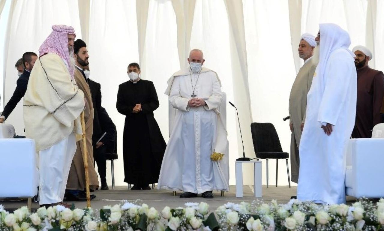 Francesco ha parlato così, oggi 6 marzo, nel corso nell’incontro interreligioso nella piana di Ur dei Caldei, dove è giunto da Nassiriya. La terra da dove, secondo il racconto biblico, Abramo – considerato il padre delle fedi monoteiste: Ebraismo, Cristianesimo e Islam – partì guidato da Dio per fondare un nuovo popolo e una nuova alleanza con la divinità. “Sta a noi dissolvere con chiarezza i fraintendimenti – ha detto ancora Francesco -. Non permettiamo che la luce del Cielo sia coperta dalle nuvole dell’odio! Sopra questo Paese si sono addensate le nubi oscure del terrorismo, della guerra e della violenza”.