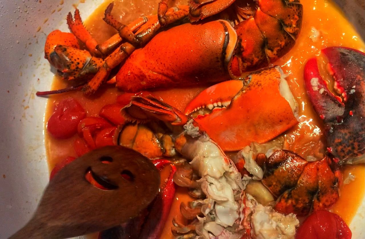 Esecuzione: prendete la vostra solita ampia e alta padella antiaderente, un fondo di olio evo e uno spicchio di aglio, fate soffriggere con i pomodorini. La fiamma deve essere alta, per chi ha induzione potenza 7. Io ho appena cambiato la mia cucina e l’induzione sta diventando una scoperta ogni giorno! Appena i pomodorini si saranno ammorbiditi adagiate le 4 parti degli astici con la crosta sul fondo padella, coprite con coperchio di vetro i modo da poter controllare la cottura e girate a cottura. Unite uno spruzzo di vino bianco e fate sfumare senza coperchio.