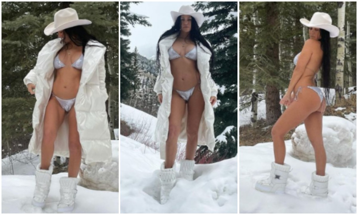 Dalla località preferita dalle celebrità per “svacanzare” durante la stagione fredda, scatti davvero “hot” in bikini e poco più. Nelle fotografie pubblicate su Instagram Kourtney indossa un duepezzi con reggiseno a triangolo color platino. Lo slip è minuscolo, con laccetti sottili. In testa ha un cappello bianco a falde larghe, un po’ “cow boy” ma più “elegantino”. Per non morire letteralmente di freddo, sopra al bikini ha indossato un piumino candido che le arriva ai polpacci.