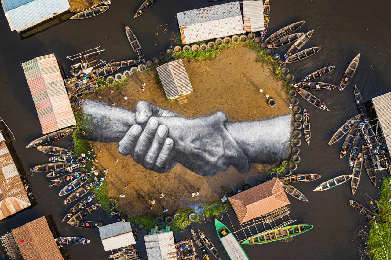 La decima tappa del progetto ha toccato nei giorni scorsi il Benin, in Africa subsahariana, un Paese molto povero. Saype ha portato la sua stretta di mano gigante. L’artista da sempre sceglie luoghi simbolici per le sue opere, e questa volta la tela per il suo dipinto è stata la città di Ouidah, nota per il suo ruolo chiave nella tratta degli schiavi. “Ho voluto ricordare che qui è nata la schiavitù” ha detto l’artista. L’opera di Saype si caratterizza per un forte desiderio di cambiare le cose. Ma non solo. Cerca in primo luogo di rispettare l’ambiente. I suoi graffiti sull’erba sono realizzati grazie a un particolare tipo di pittura biodegradabile al 100% e materiali totalmente naturali. I suoi lavori sono dunque effimeri e non hanno un impatto ambientale: il dipinto sparisce via via che l’erba cresce.