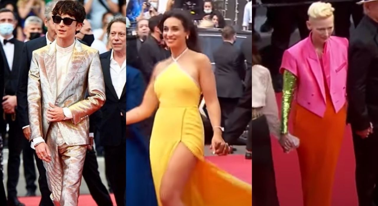 A Cannes, l’attore partecipa al red carpet con un completo grigio metallizzato firmato Tom Ford, abbinato ad un paio di occhiali da sole. Per l’anteprima di The French Dispatch arriva a Cannes anche Tilda Swinton. Dopo l’omaggio a Pier Paolo Pasolini a Roma, l’attrice ha infiammato il red carpet della kermesse francese con un look esuberante e colorato firmato Haider Achermann. Il completo è composto da una gonna a vita alta a sirena color arancia, abbinata ad una giacca a maniche corte rosa confetto sotto la quale spunta il verde delle maniche lunghe tempestate di paillettes.